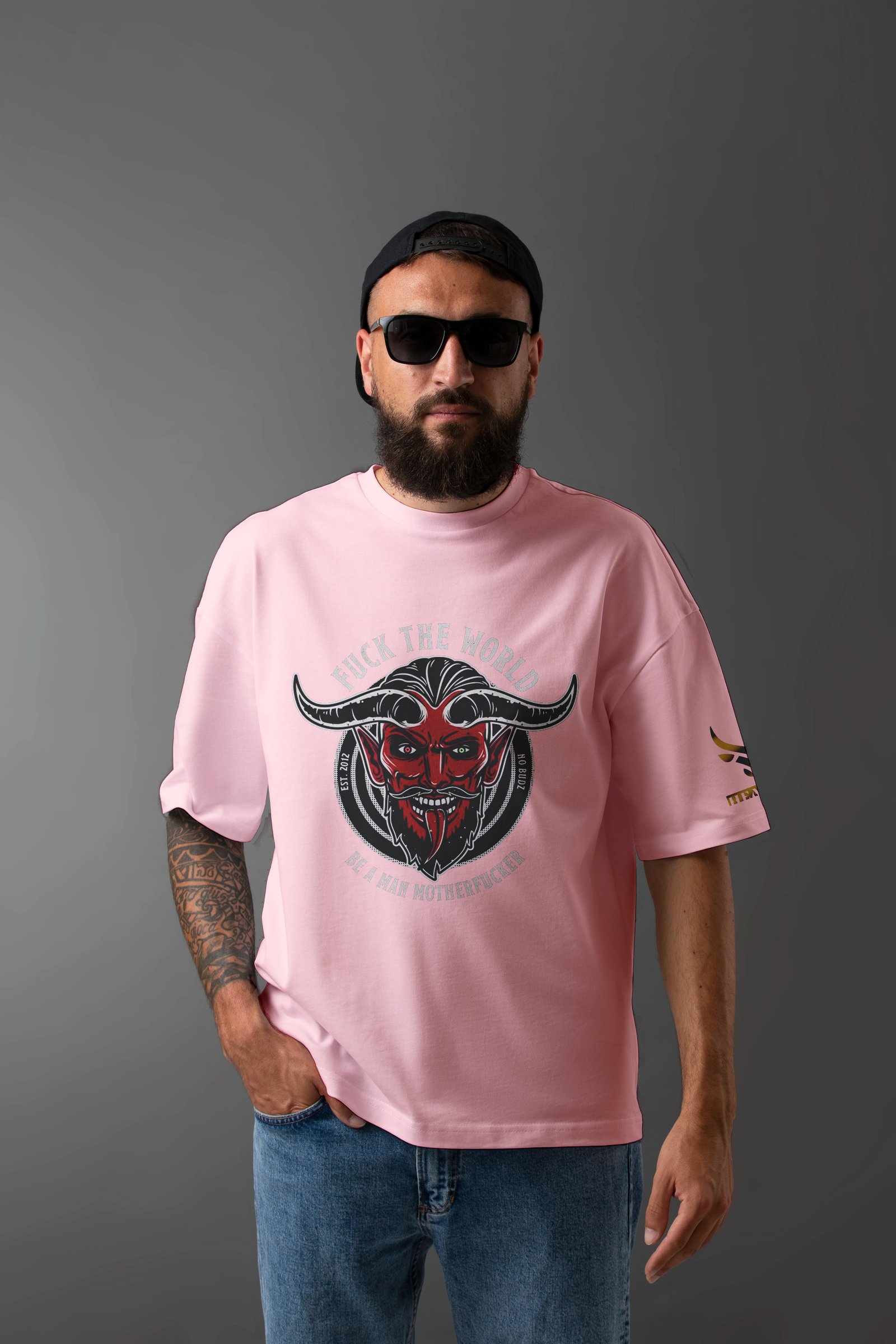 Featuring a striking red devil face with twisted horns and piercing eyes, this design exudes pure dominance and rebellion. Set against a hypnotic black-and-white vortex, the "F" THE WORLD*** and "BE A MAN, MOTHERF*ER"** typography reinforce a fearless, no-holds-barred attitude.
