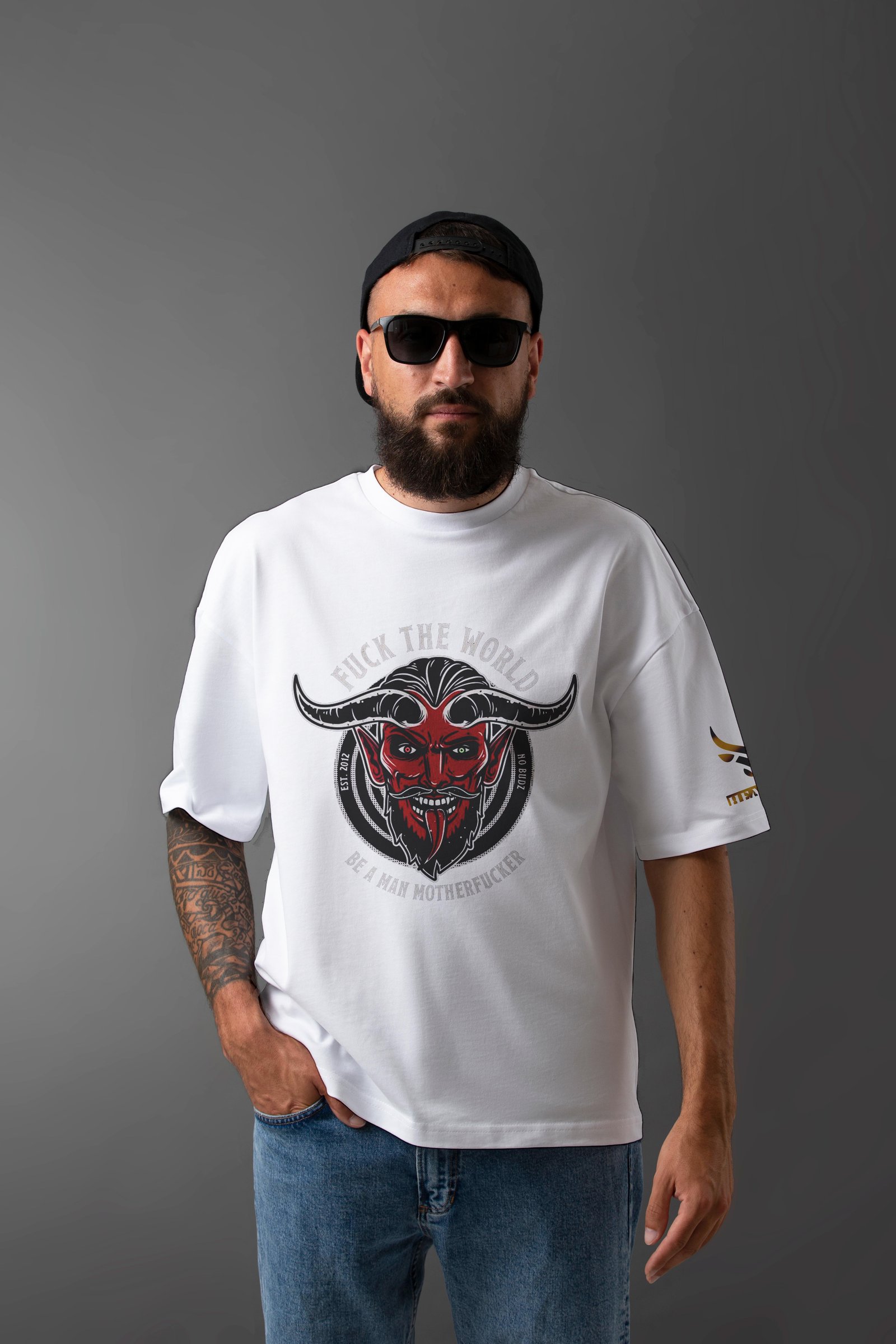 • Featuring a striking red devil face with twisted horns and piercing eyes, this design exudes pure dominance and rebellion. Set against a hypnotic black-and-white vortex, the "F" THE WORLD*** and "BE A MAN, MOTHERF*ER"** typography reinforce a fearless, no-holds-barred attitude.
