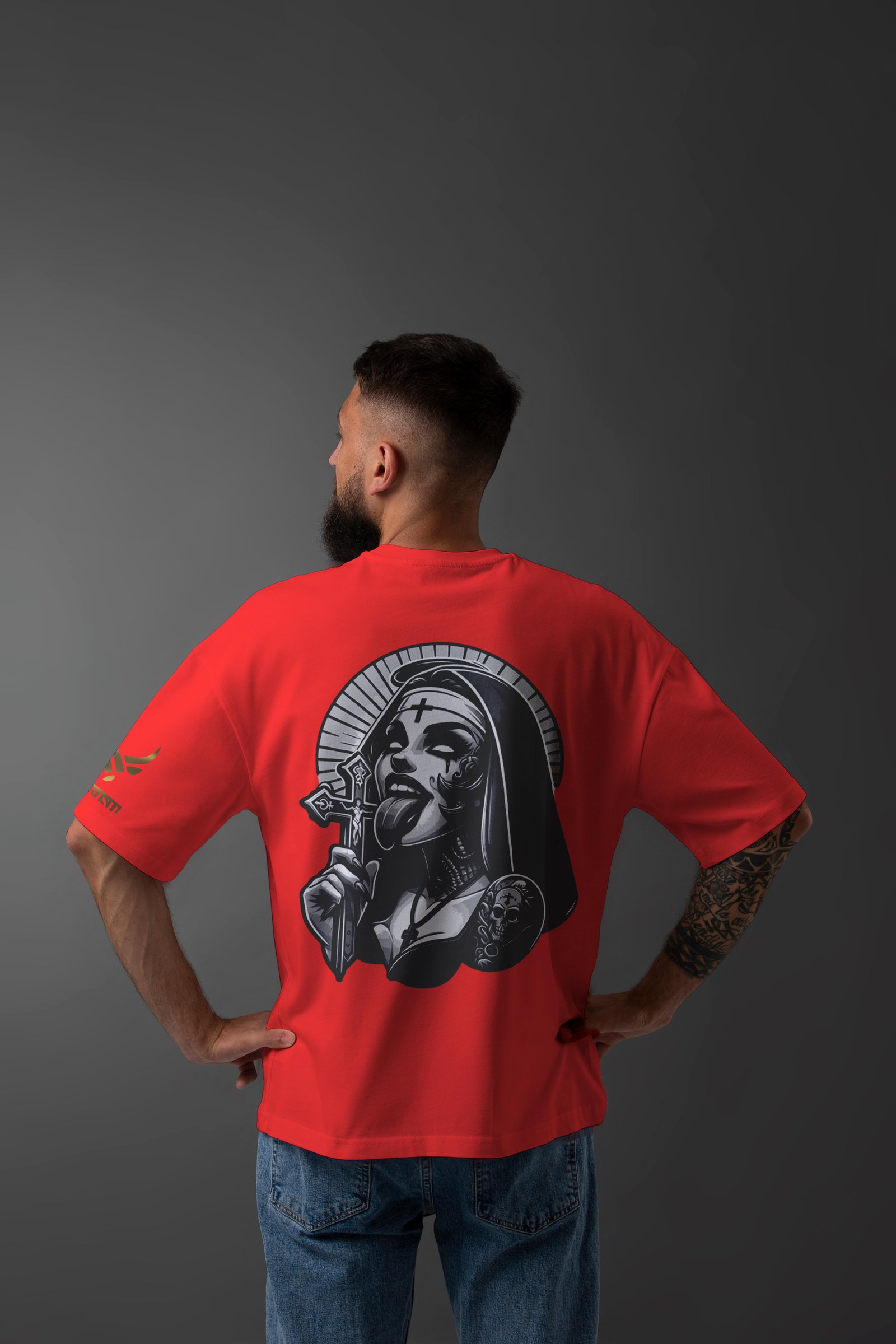 Dare to break the rules with the "SINFUL DEVOTION" Oversized T-Shirt. Featuring a striking black-and-white tattoo-style illustration, this design showcases a seductive, inked nun with a twisted, provocative edge-her tongue out, gripping a gothic cross, exuding both mystery and defiance.