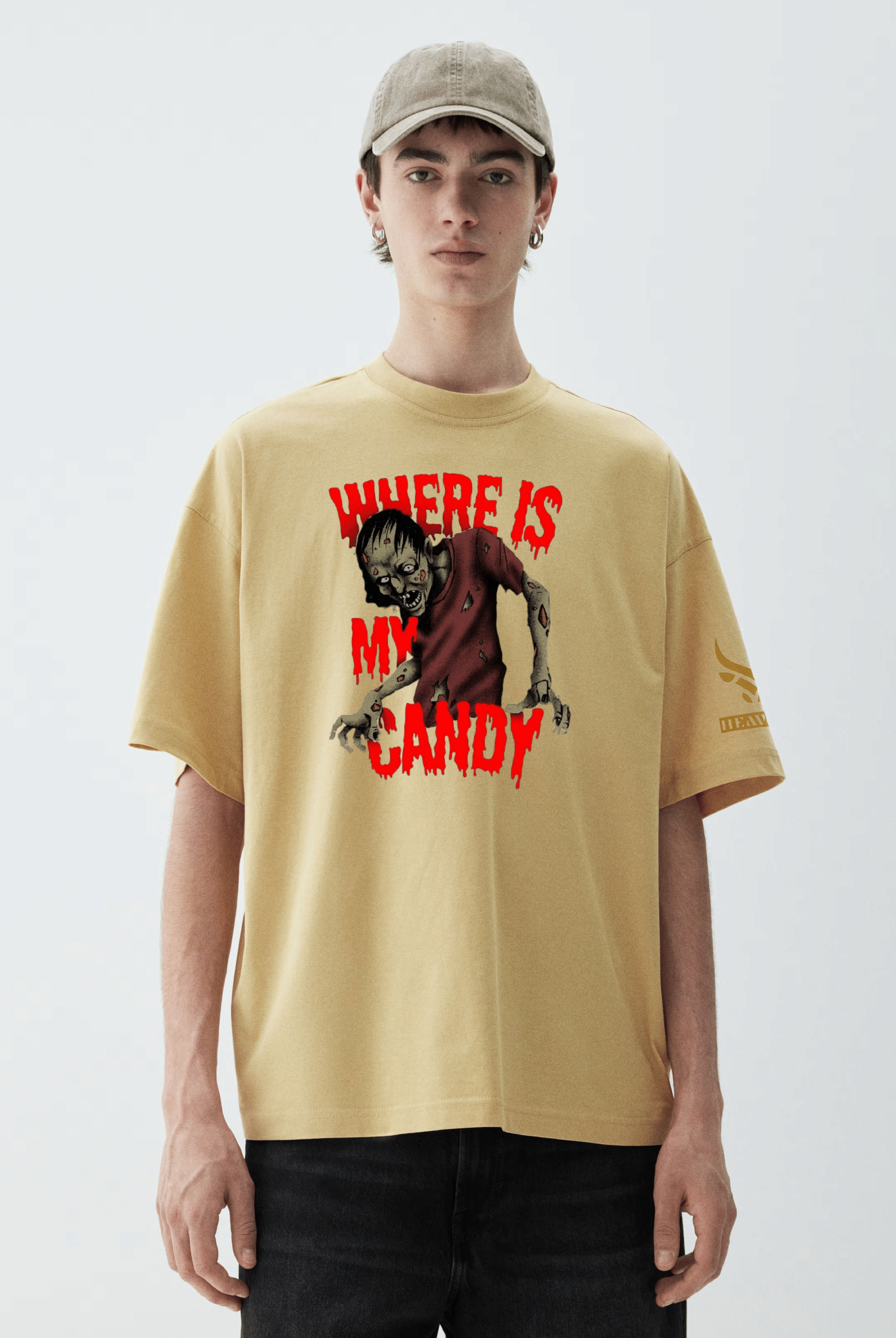 • Step into the eerie side of streetwear with the “ZOMBIE CRAVE” Oversized T-Shirt,  Featuring a disturbingly detailed, undead zombie with glowing eyes and rotting flesh, this graphic tee screams attitude. The dripping "WHERE IS MY CANDY" blood-red typography adds an extra dose of horror, making it the perfect choice for Halloween lovers, goth enthusiasts, and those who embrace the macabre.