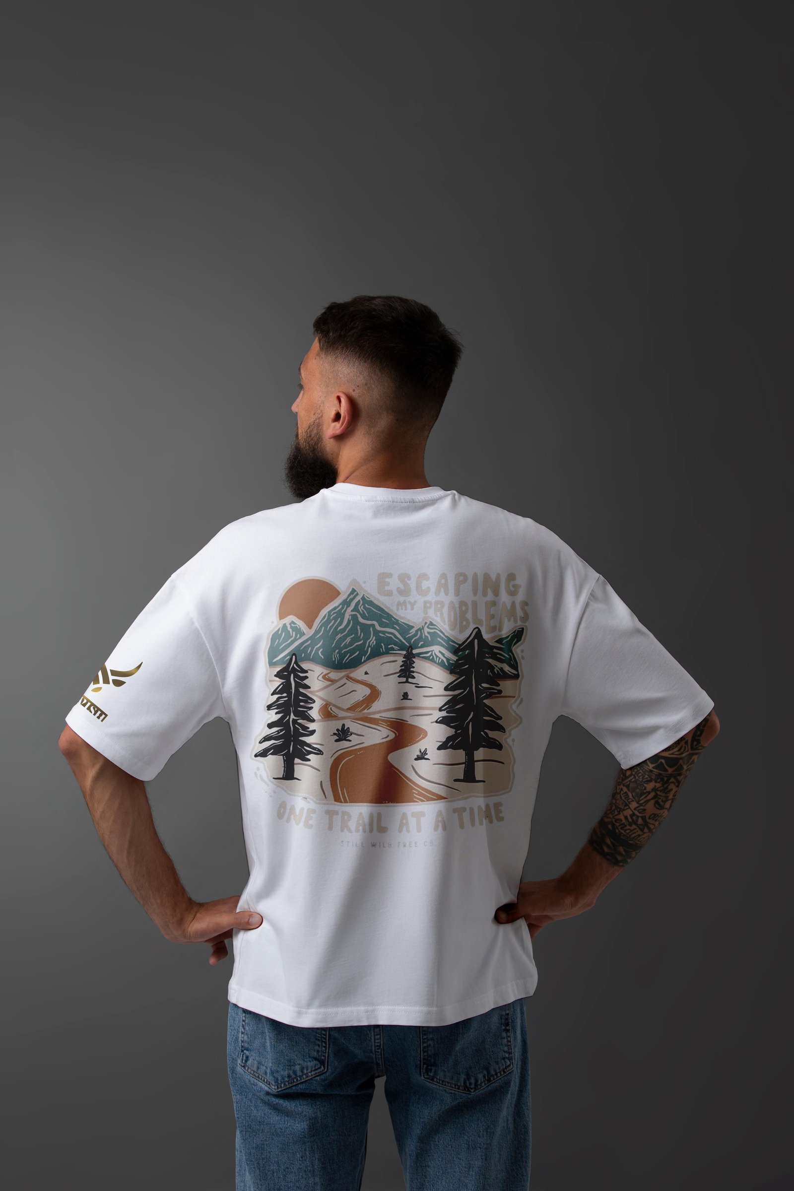 Step into the wild and leave your worries behind with the "ESCAPING MY PROBLEMS" Oversized T-Shirt-a must-have for adventurers, wanderers, and free spirits.