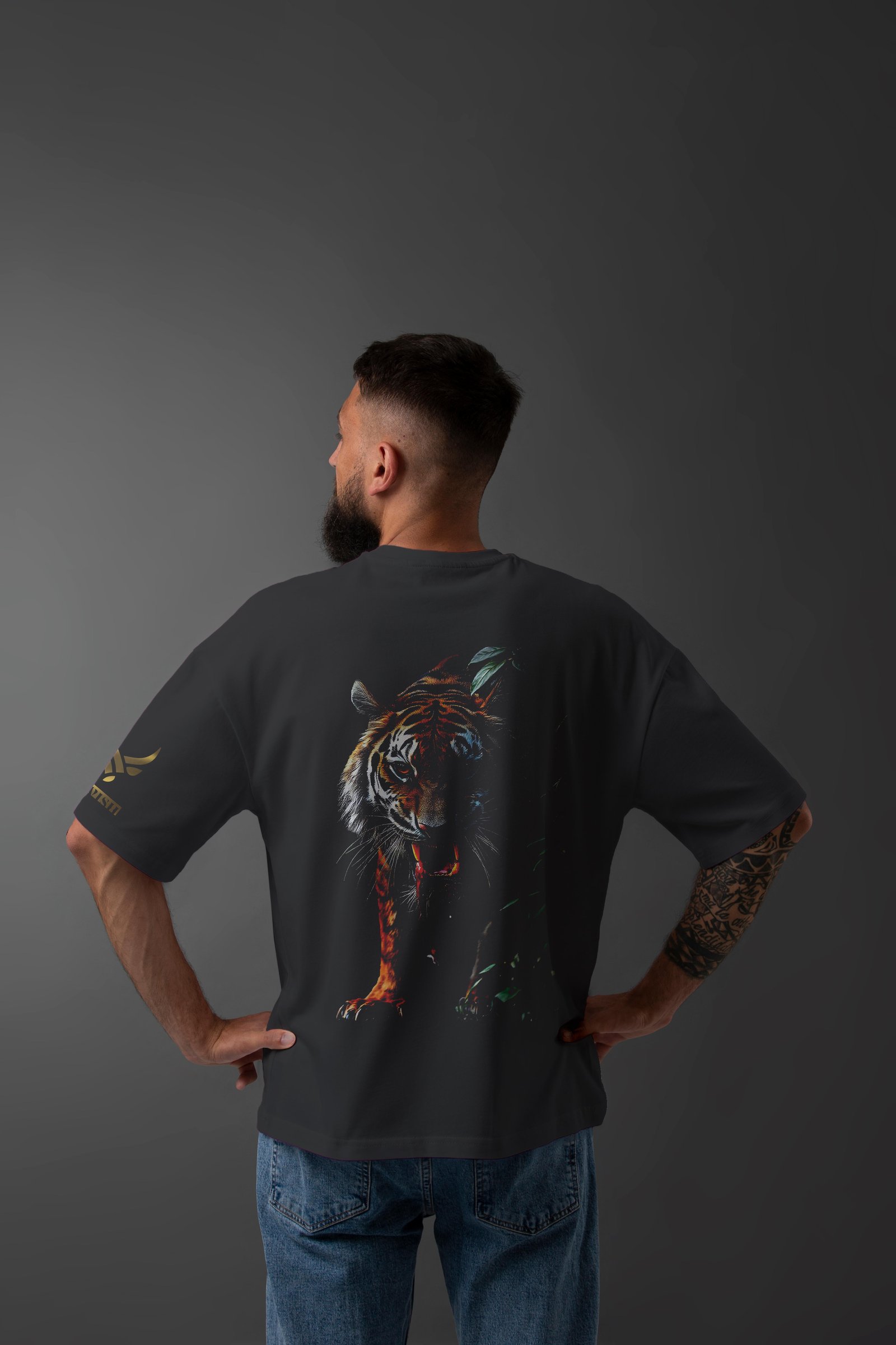 Unleash your wild side with the "ROAR OF THE WILD" Oversized T-Shirt-a bold statement piece featuring a breathtaking, hyper-realistic design of a roaring tiger, blood-stained fangs bared in raw power. Set against a deep black backdrop with lush jungle leaves framing its piercing gaze, this graphic tee is the perfect blend of strength and style.